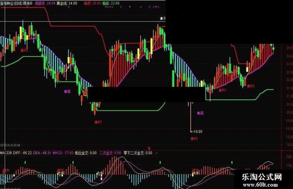 DRAWTEXT(CROSS(VA1,VA2)AND(C>=O)AND 黄金线>REF(黄金线,1),VA1*0.97,'★B2'),COLORRED;