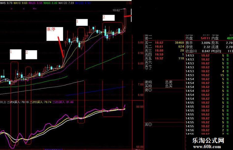 原理:第一次拉升是庄家吸筹盘整时期。一般不会有很大的升幅。而第二次拉升是庄家吸筹完成后真正希望股价大升吸引散户的方法。所以涨停的几率大增