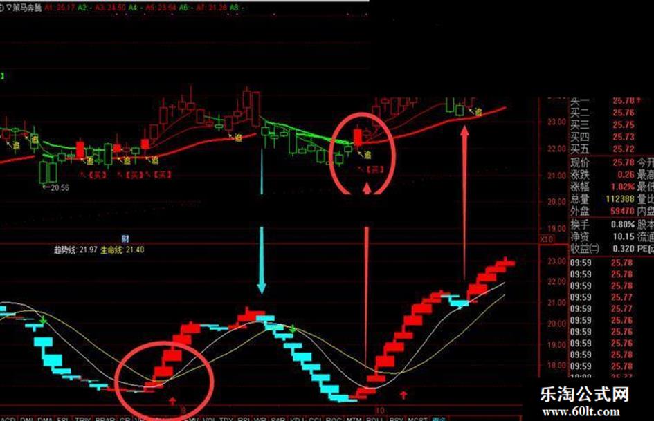 幅图指标使用趋势线和生命线交叉确定买入和卖出的操作,并用红色和蓝色台阶辅助确定操作时间。 指标使用简介:1,买入:当出现第一根红柱时可少量买入,当趋势线上穿生命线时加仓买入,只要趋势线大于生命线并一路红柱,就一直持有; 2,卖出:当出现第一根蓝柱时可半仓卖出,当趋势线下穿生命线时清仓观望。只要趋势线小于生命线并一路蓝柱,就一直观望。 3,特别强调,指标绿色向下箭头(卖出信号)迟后,当红柱走平时就可以减仓或清仓。指标有不妥的地方,烦请大家改进和优化。