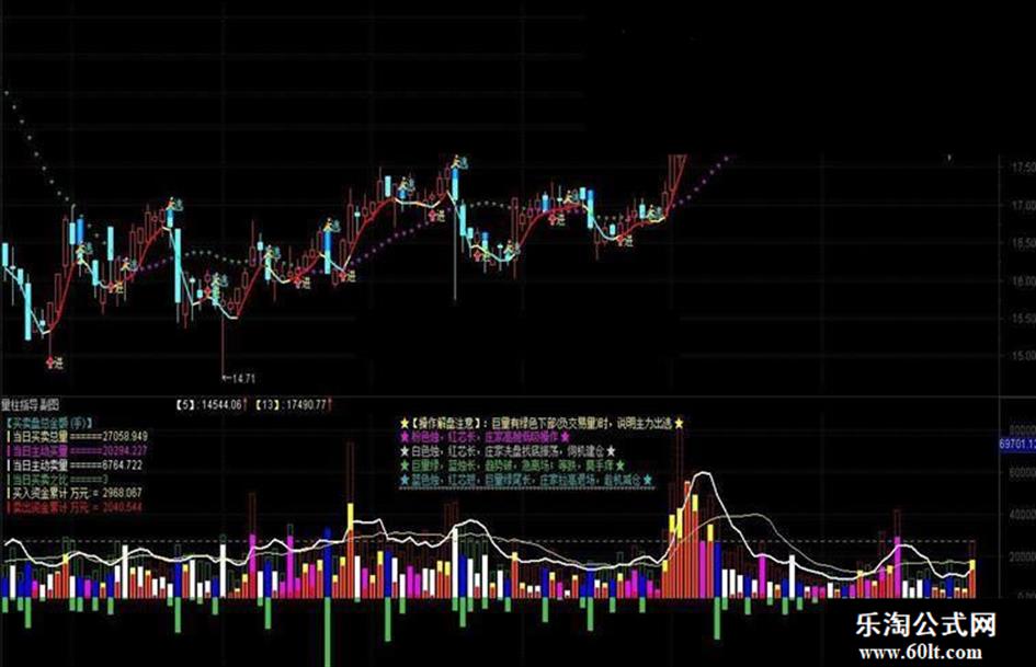 DRAWTEXT_FIX(1,0.399,0.001,0,'★【操作解盘注意】:巨量有绿色下部(负交易量)时,说明主力出逃 ★'),COLORYELLOW;