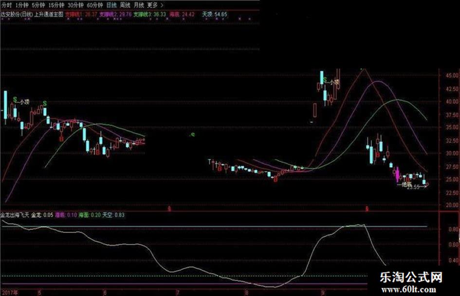VAR1:=LLV(L,50); VAR2:=HHV(H,50); VAR3:=EMA(C,2); 金龙:EMA((VAR3-VAR1)/(VAR2-VAR1),8)COLORYELLOW; 潜底:0.1,COLORMAGENTA; 海面:0.2,COLORGREEN,DOTLINE; 天空:0.83,COLORCYAN;