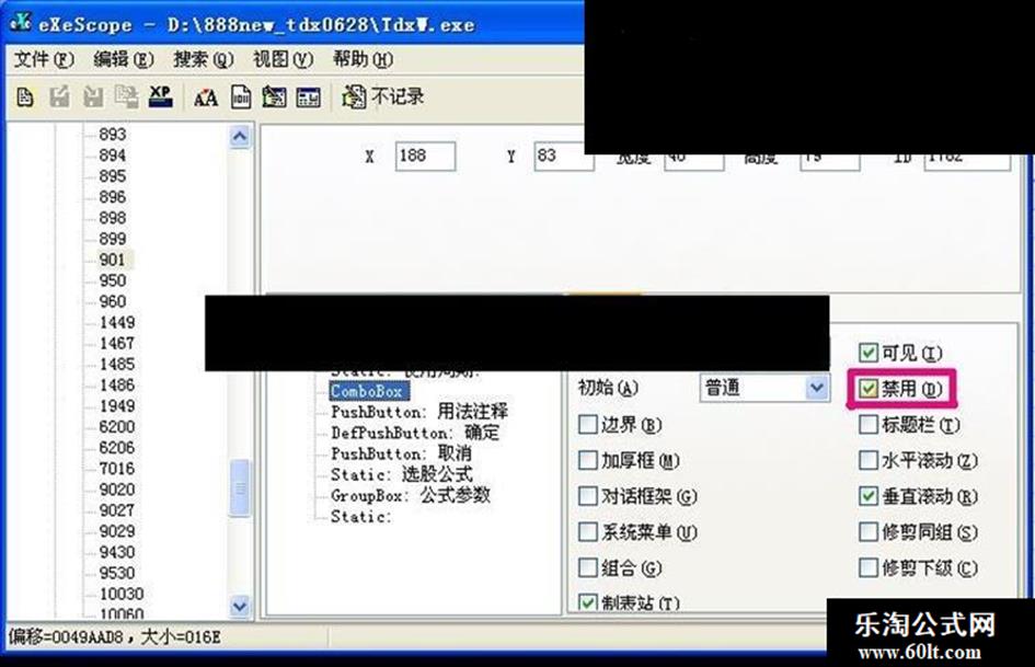 通达信分时预警设置 先将预警公式设为条件选股公式。之后,下载eXeScope软件,安装完毕后,在通达信安装文件夹中用右键点击TdxW.exe图标,再点击“用 eXeScope编辑资源”,出现下面对话框: 点击:资源→对话框→901→Dialog:901→ComboBox,出现下列对话框:将“禁用”前的“√”去掉,公式条件预警设置中的时间周期就能无限制使用了。