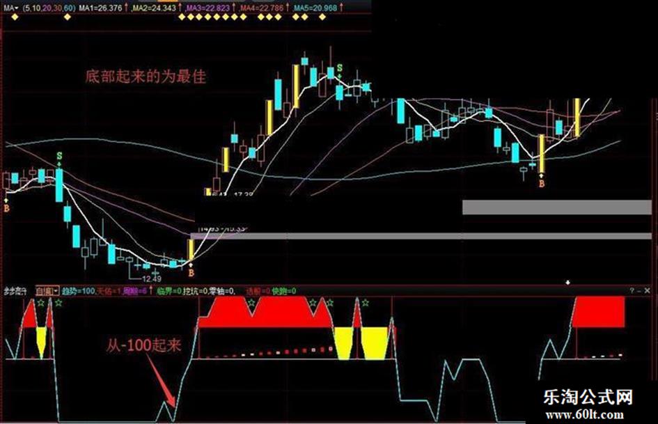 步步高升指标,通达信和益盟操盘手副图指标。副图有一条蓝色的趋势线,是上像空中楼阁一样的红房子的神秘通道。趋势线从底部区域上穿0轴,通过神秘通道进入了红房子,就要把握时机。红房子有缺口的时候,要注意风险。红房子被砸破的时候,要赶紧逃命了。