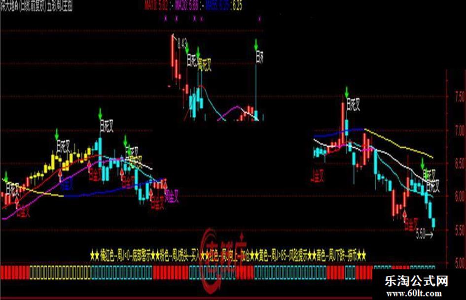 简单说明:为了能将周KDJ的J线走势的各种形态(下跌到0轴以下、在0轴以下拐头向上、突破0轴向上、进入风险区及下跌等)的讯号及时提供给使用者,及时采取相应的不同的操盘策略,特将周J的各种走势形态用五彩K线方式编辑显示在主图中,同时标示出日、周、月KDJ的金叉与死叉。可以让使用者一目了然地看清楚K线走势的同时也清晰地显示了周KDJ的状态。