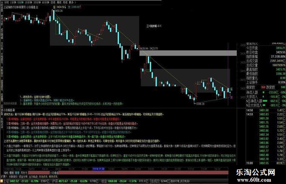 DRAWTEXT_FIX(1,0.001,0.001,0,'研判方法:前15分钟3根蜡烛 (每5分钟一根) 对全天的影响占70%,其后15分钟1根蜡烛 (9:45---10:00) 对全天的影响占30%。前后相加共4根蜡烛,可预测全天行情趋势。'),COLORYELLOW;