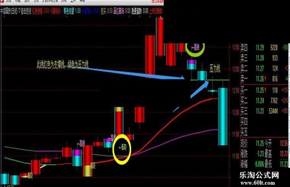 2、指标中会出现红色和绿色的横线--红线代表支撑,绿线代表压力位置