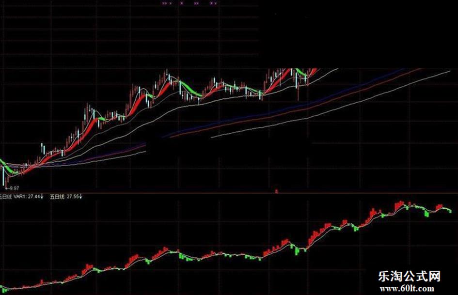 VAR1:EMA(CLOSE,5); STICKLINE(CLOSE>VAR1,CLOSE,VAR1,2,0),COLORRED; STICKLINE(CLOSE<VAR1,VAR1,CLOSE,2,0),COLORGREEN; 五日线:EMA(CLOSE,10);