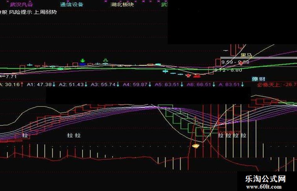 DRAWTEXT(CROSS(AA, A5) AND REF(AA,1)<34,REF(AA,1),'☆发财了'), COLORRED ;