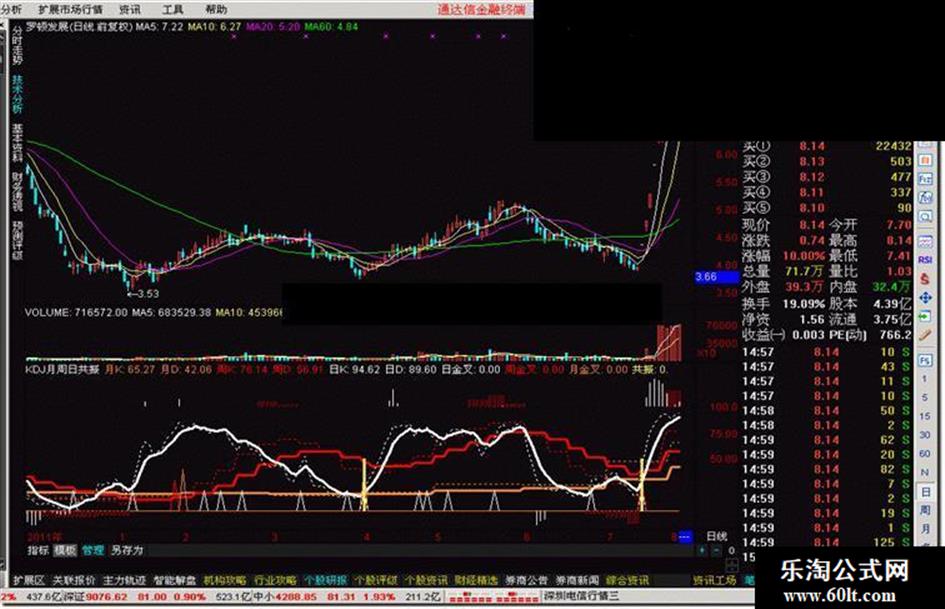 白虚线为日K线、白实线为日D线;红虚线为周K线、红实线为周D线;橙虚线为月K线、橙实线为月D线。白三角为日金叉、红三角为周金叉、橙三角为月金叉(都是D值40以下或60以上的金叉,40-60之间的金叉不显示)。0之下和100之上的橙虚柱为月J值、红虚柱为周J值、白柱为日J值(0-100之间的J值不显示)。月周日任意两个金叉共振时,在共振处显示一根黄色柱线。