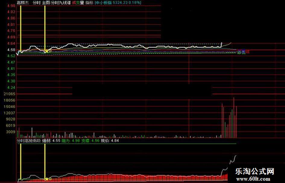 九线说明:蓝色线:现价 黄色线:均价 粉色线:参考线 红色线:昨日最高价线 绿色线:昨日最低价线 红虚线:阻力 蓝虚线:支撑 白虚线:强弱 青虚线:前高