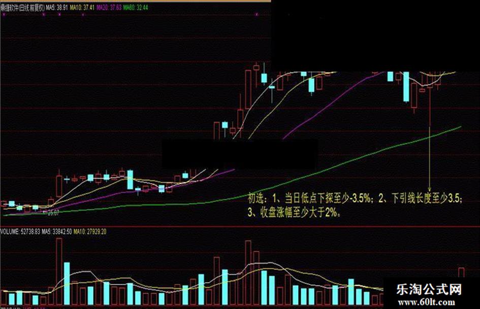 公式初选: 初选三条件: 1、当日低点下探至少-3.5%;2、下引线长度至少3.5%; 3、收盘涨幅至少大于2%。