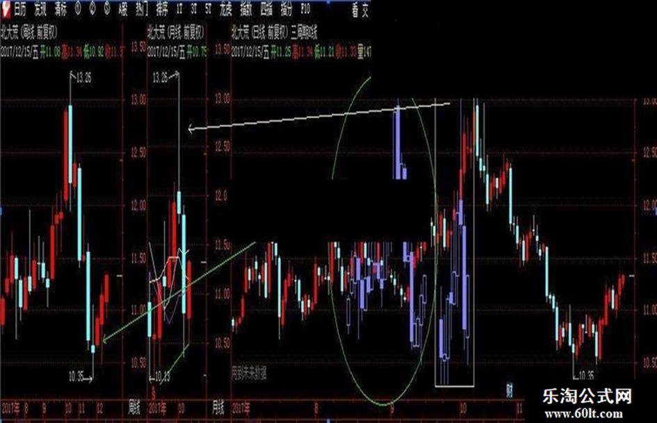 有网友说通达信升级后显示不正常,今天抽时间更新了一下,现上传最新公式“三周期K线”打开就可以看到了,目前在通达信V5.90 17061313版本上显示正常。