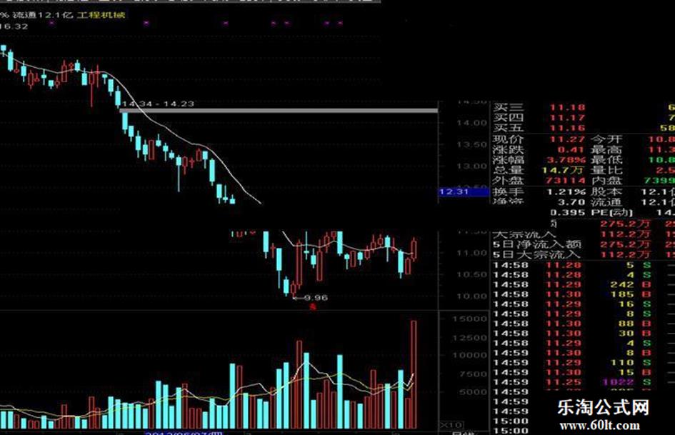 当满足条件净流>0时,在0和净流位置之间画柱状线,宽度为1.5,0不为0则画空心柱.,COLOR0000FF