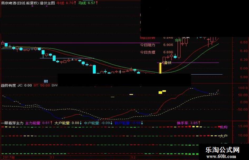 潜伏主图,当一个票经过一轮调整后,价格开始上穿牛线,且MACD金叉或者KDj金叉时,股价处在相对低位时,此股有上涨空间;注意股价的所在位置,当股价在前期高点平台附近时谨慎操作。 源码分享,方便大家继续优化。