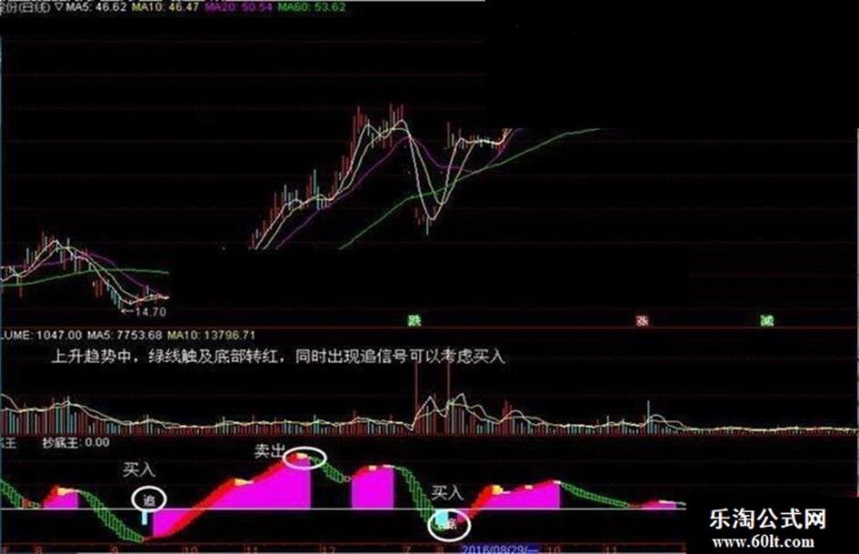 指标试用方式已在图中注明。 当一波下跌之后,绿线触及底部位置,开始向上翻红,可以短线买入, 行情拉升触及60日均线卖出,又不错的获利。 如果出现追,或 底信号则更好。 后面会再给一个配合使用的主图指标,敬请期待。