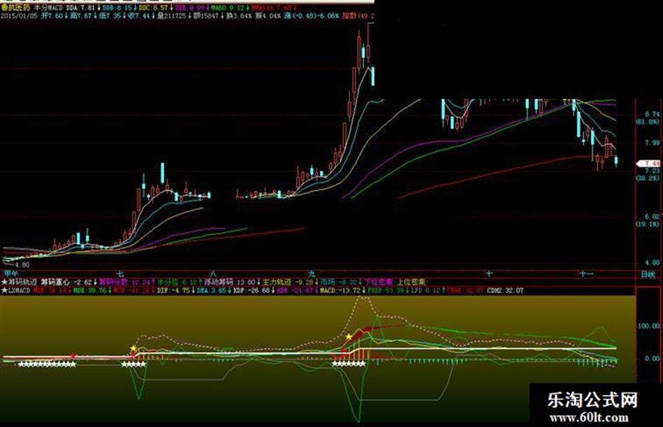 为什么说是半分MACD,因为参数取常规MACD的一半。DDA,DDB二线会伴随股价起伏,只要收盘价下穿这两条线此二线则拐头。关键看点有二,一是DDA,DDB,DDC三线形成的三只爪;二是DDA,DDB,DDC,DDE与60日线形成的三爪或五爪。此源码应该可以通用。