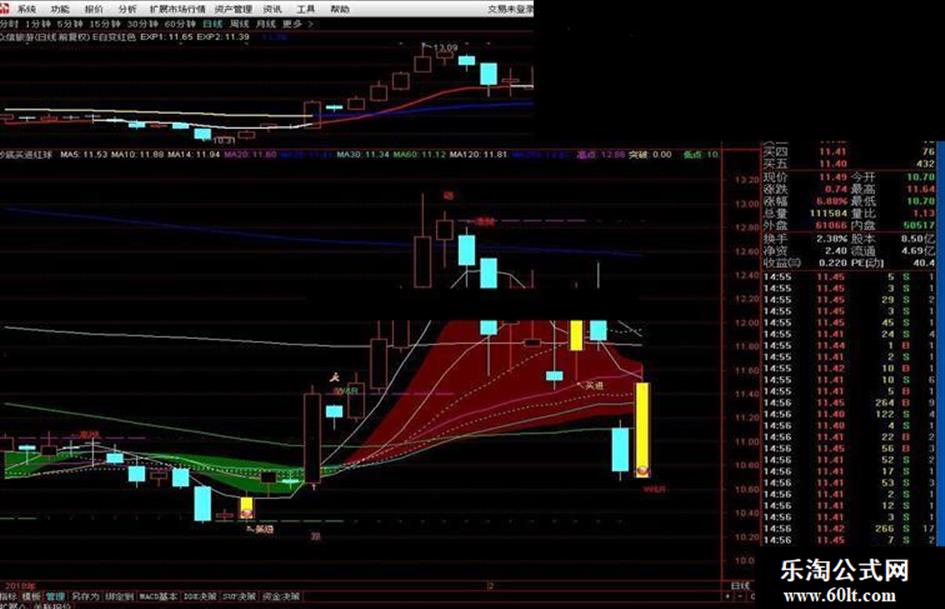 DRAWTEXT(FILTER(买=1,5),LOW-0.05,'↖买进'),COLORYELLOW;