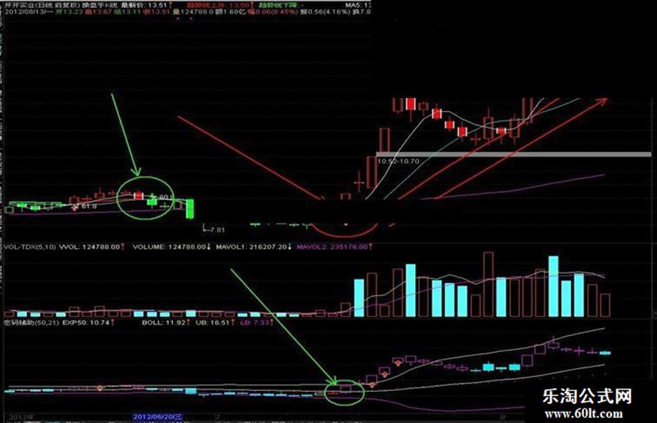 趋势线上升:IF(买线>卖线 AND SJTJ,卖线,DRAWNULL),LINETHICK2,COLORRED;