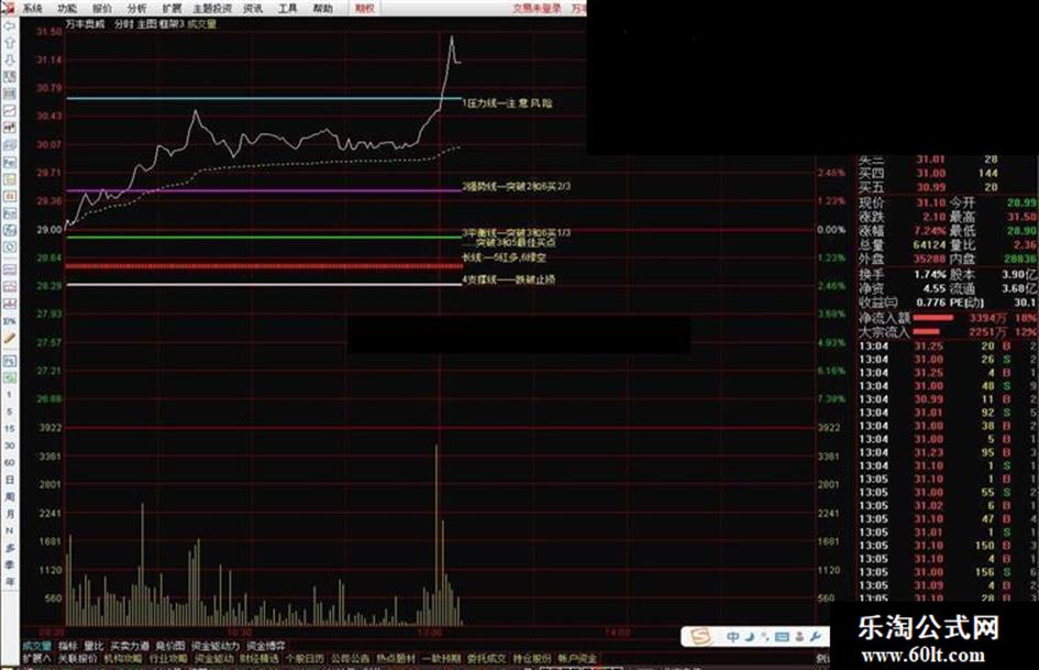 2:四条指标线,在通达信分时图上,1压力线,2强势线,3平衡线,4支撑线,逐一用文字标示,一目了然,