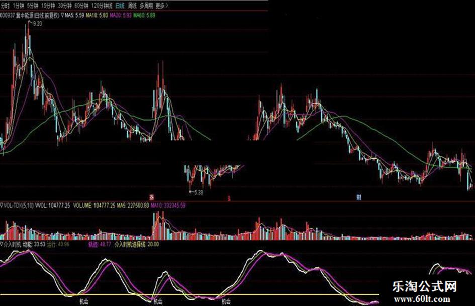 1、动能线(白色)从下方向上(低于23即可),动能值超过23时即为介入时机(具体数值可在源代码中调整,数值越低指标越灵敏,但趋势可靠性会降低。同理,此数值越大指标提示的介入时机越滞后,具体数值根据个人喜好设定);