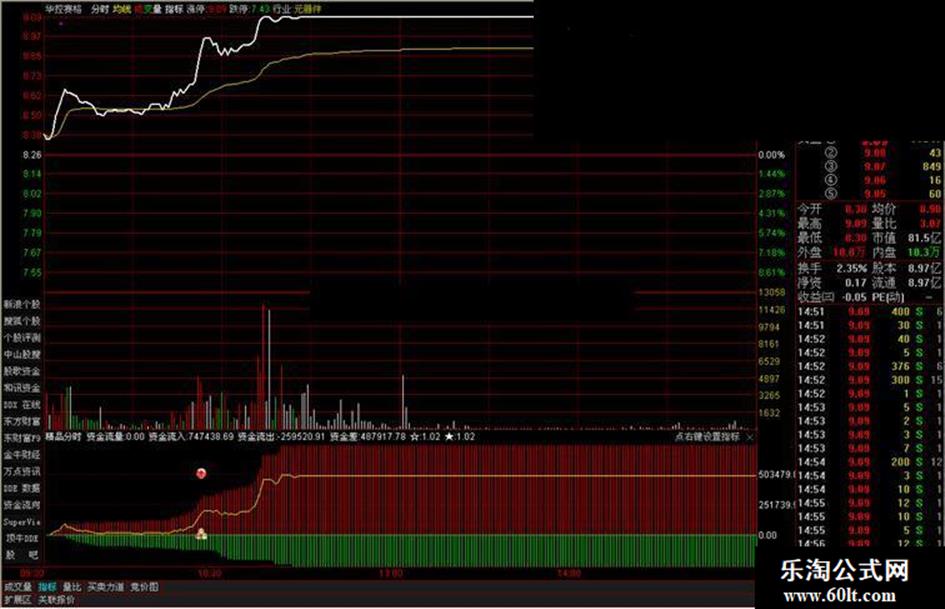 输出资金流入:如果收盘价>1日前的收盘价,返回收盘价*成交量(手),否则返回0的当前离开盘分钟数日累和,STICK,画红色