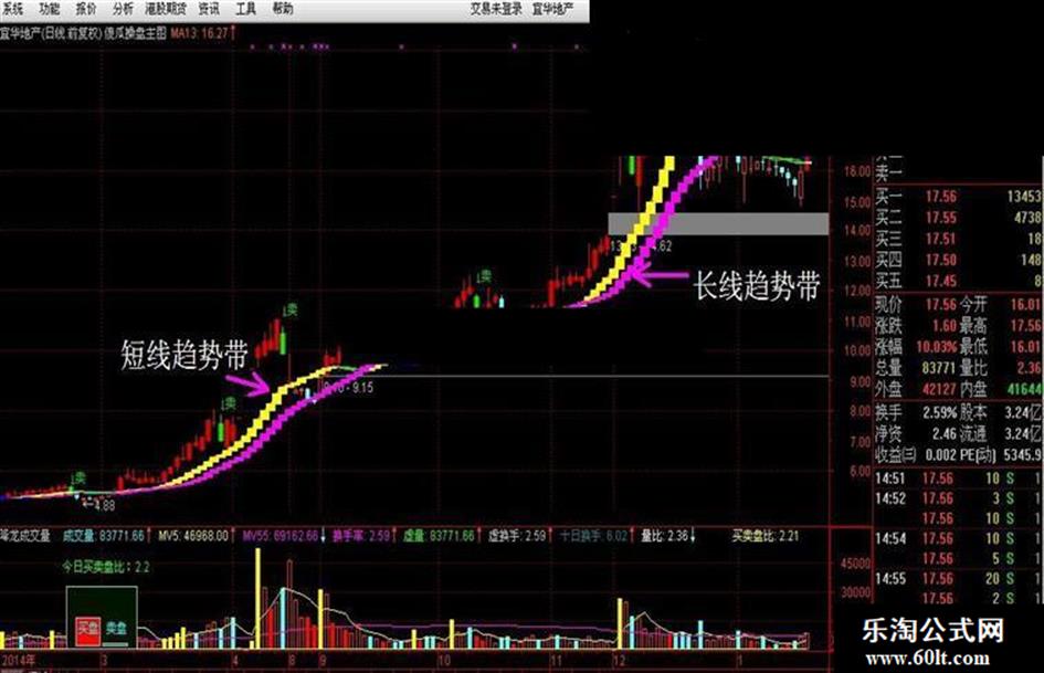 3、该指标中含有二个趋势带:短线趋势带与长线趋势带。