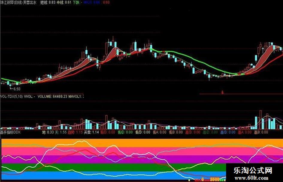 DRAWBAND(0,RGB(0,139,255),0.5,RGB(0,139,255)),COLORFF8B00; DRAWBAND(0.5,RGB(0,120,0),1,RGB(0,120,0)),COLOR007800; DRAWBAND(1,RGB(187,0,187),1.5,RGB(187,0,187)),COLORBB00BB; DRAWBAND(1.5,RGB(255,58,133),2,RGB(255,58,133)),COLOR853AFF; DRAWBAND(2,RGB(255,152,0),2.5,RGB(255,152,0)),COLOR0098FF; DRAWTEXT(ISLASTBAR,0.25,'███'),COLORFF8B00; DRAWTEXT(ISLASTBAR,0.25,'冰冻'),COLORFFFFCC; DRAWTEXT(ISLASTBAR,0.75,'███'),COLOR007800; DRAWTEXT(ISLASTBAR,0.75,'冷门'),COLORWHITE; DRAWTEXT(ISLASTBAR,1.25,'███'),COLORBB00BB; DRAWTEXT(ISLASTBAR,1.25,'活跃'),COLORFFFFCC; DRAWTEXT(ISLASTBAR,1.75,'███'),COLOR853AFF; DRAWTEXT(ISLASTBAR,1.75,'热门'),COLORWHITE; DRAWTEXT(ISLASTBAR,2.25,'███'),COLOR0098FF; DRAWTEXT(ISLASTBAR,2.25,'高温'),COLORWHITE; {计算数据} R:=PERIOD; S:=FROMOPEN;VA1:=EMA(CAPITAL/IF(R=0,SUM(VOL,S),VOL)/CLOSE,10)/CLOSE; 地:IF(VA1>=2.5,2.5,VA1),COLORYELLOW,LINETHICK2; 天: POW(ATAN(EMA(CAPITAL/IF(R=0,SUM(VOL,S),VOL)/CLOSE,10)),2),COLORB5CA43,LINETHICK2; 趋势: EMA(WINNER(CLOSE)*100,10)/50,LINETHICK2,COLOR0015FF; 买卖: EMA((-3)*(HHV(HIGH,30)-CLOSE)/(HHV(HIGH,30)-LLV(LOW,30))+2.7,9),COLORWHITE,LINETHICK2; {低位信号} 低①:买卖<0,COLORRED,NODRAW; STICKLINE(低①,0,-0.1,3,0), COLORRED; 低②:买卖<0.1 AND 买卖>0 AND 买卖>=ref(买卖,1),COLORGREEN,NODRAW; STICKLINE(低②,0,-0.1,2.5,0), COLORGREEN; 低③:买卖<0.25 AND 买卖>0.1 AND 买卖>=ref(买卖,1),COLORYELLOW,NODRAW; STICKLINE(低③,0,-0.1,2,0), COLORYELLOW; 低A:买卖<0 AND 买卖>=ref(买卖,1),COLOR0099FF,NODRAW; STICKLINE(低A,0.1,-0.1,3,0), COLOR0099FF; 低B:买卖<ref(HHV(买卖,5),4) AND 买卖>=ref(买卖,1) AND 买卖<0.8 AND 趋势>=ref(趋势,1) AND ref(EXIST(买卖<=ref(买卖,1),2),1) AND ref(EXIST(买卖<=0,10),8),COLOR0099FF,NODRAW; STICKLINE(低B,0.3,0,3,0), COLOR0099FF; {高位信号} 高①:买卖>2.5 AND 买卖>ref(买卖,1),COLORRED,NODRAW; STICKLINE(高①,2.6,2.4,3,0),COLORRED; 高②:天>=1.9 AND 买卖>=2.2 AND CROSS(ref(HHV(买卖,3),3),天),COLOR007800,NODRAW; STICKLINE(高②,2.6,2.4,2.5,0),COLOR007800; 高③:天<1.77 AND 买卖>=2.2 AND CROSS(ref(HHV(买卖,7),6),天),COLORFF8B00,NODRAW; STICKLINE(高③,2.6,2.4,2,0),COLORFF8B00; 高A:买卖>2.45 AND 买卖<2.5 AND 买卖<=ref(买卖,1), COLORRED,NODRAW; STICKLINE(高A,2.5,2.4,3,0), COLORRED; 高B:买卖>ref(LLV(买卖,5),4) AND 买卖<=ref(买卖,1) AND 买卖>1.5 AND 趋势<=ref(趋势,1) AND ref(EXIST(买卖>=ref(买卖,1),2),1) AND ref(EXIST(买卖>=2.48,10),8), COLOR0099FF,NODRAW; STICKLINE(高B,2.7,2.4,3,0), COLOR0099FF;