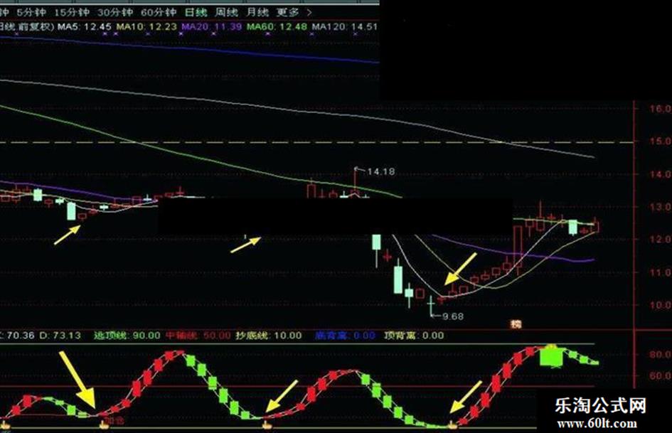 底背离:REF(CLOSE,A1+1)>CLOSE AND K>REF(K,A1+1) AND CROSS(K,D);