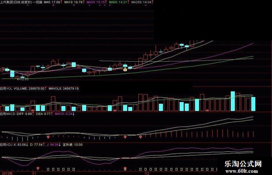 该指标不仅镶嵌了均线系统、成交量、MACD、KDJ四个指标,在均线系统里又增加了60日均线和250日均线,绝大多数黑码股在启动之初,其股价在放量上穿30日或60日均线,并在它们上方带量运行一段时间后,在向下滑落过程中一般都会受30、60日均线的有力支撑,从而形成更为有力的涨升行情。30日均线能有如此神秘的力量,正是它是中短期和中长期均线系统的结合点。60日均线之所以也能有如此神秘的力量也决非偶然,其中也更隐藏着更为重大的战略意义,那就是绝大多数已被主力控制很深业以完成总体建仓的股票,主力大多会在拉升行情启动之前,再来一次紧急而迅速的集中建仓或增仓,且时间都控制在三个月左右。所以起涨点恰巧都落在60日均线上。250均线又称年线,反映的是长期趋势,有牛熊线之称,股价只有站上年线才能具备产生黑码和大牛股的基础。所以,该指标兼备了既可对短期、又能对中长期趋势进行分析的指标。只要镶嵌的四个指标有两个共振就会发出图标信号。