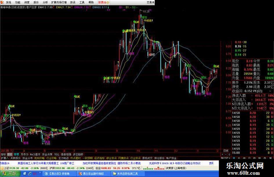DRAWTEXT(CROSS(庄家,散户) AND 散户>70,H+0.05,'高减'),COLORYELLOW;