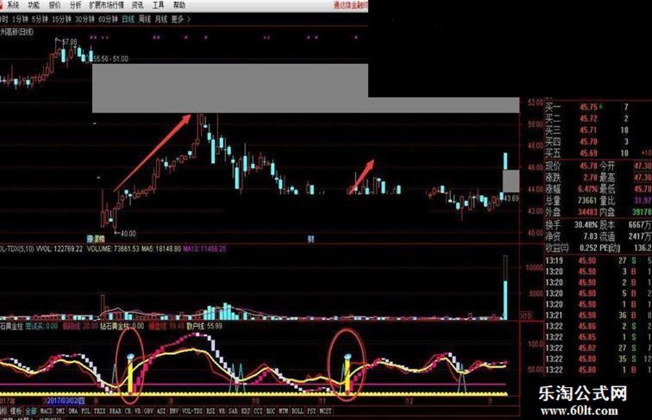 3、当钻石黄金柱与红K线叠加时,应果断出击。