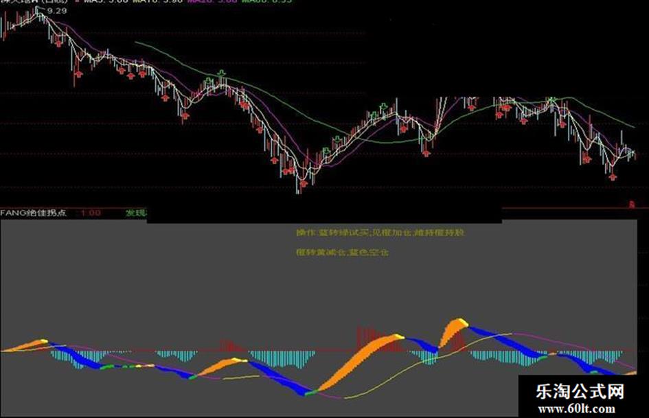 DRAWTEXT(C=C AND CURRBARSCOUNT=150,180,'操作:蓝转绿试买;见橙加仓;维持橙持股'),COLOR008987;