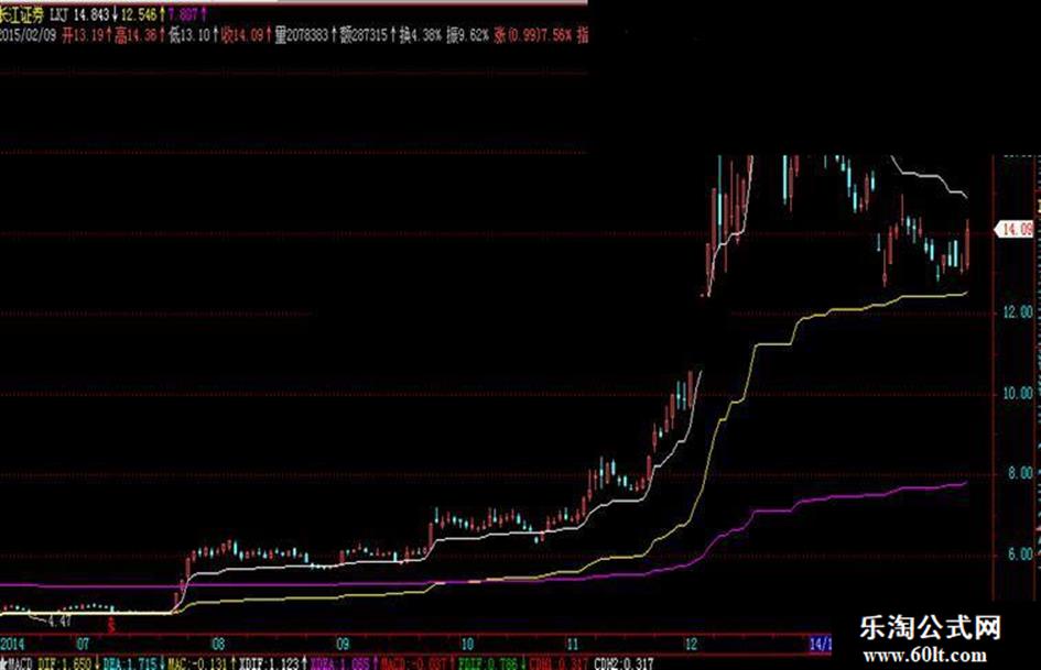 看看下面贴图,青色细线和白色黄色粗线是斜率三线,这三条线是相对稳定的,只有力度到达一定的程度,才能使其方向发生改变,图中加粗红线和细黄线是以量比作为参数的DMA,斜率反映的力度,而以量比作为参数的DMA线则反映的资金与价格的关系。所以,在我的主图中,把青色线称为跟风线,加粗白线称为跟庄线