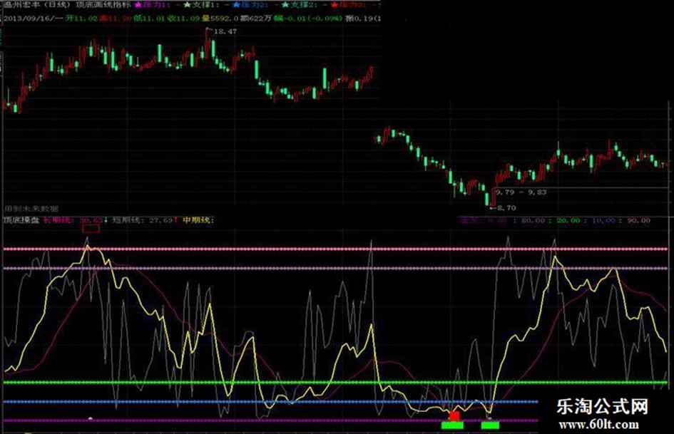 顶部区域:(中期线<REF(中期线,1) AND REF(中期线,1)>80) AND (REF(短期线,1)>95 OR REF(短期线,2)>95 ) AND 长期线>60 AND 短期线<83.5
