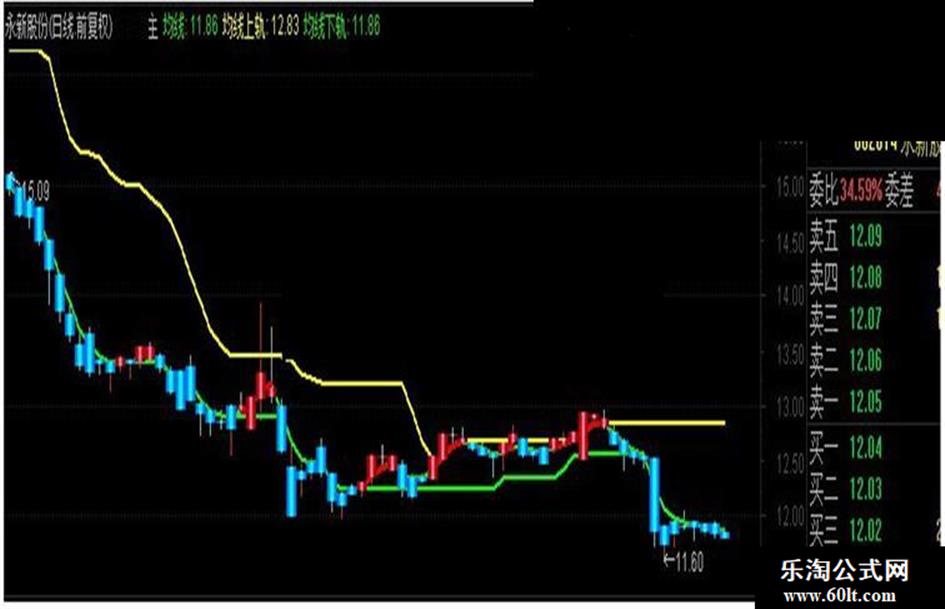 均线下轨:LLV(均线,14),LINETHICK2,COLORGREEN;