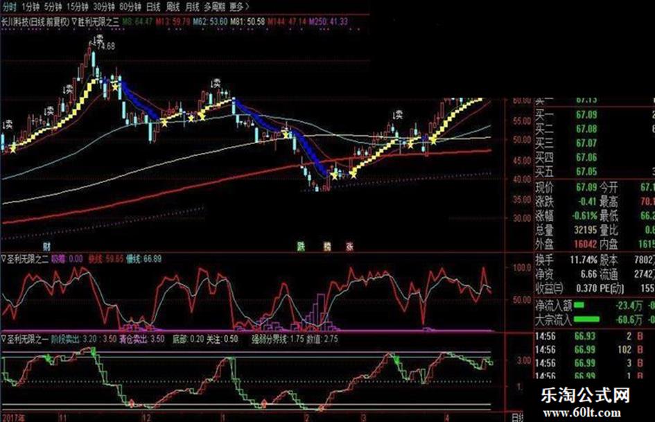 这个指标主要是帮助大家把握主力资金的建仓的情况,这个比较简单,有两条线和一个吸筹标志。吸筹标志为紫色标志,这个标志一般出现在一个下跌过程或震荡整理的时候,一波上涨的前期,根据吸筹标志的大小判断主力吸筹的量的多少,吸筹越多越大,行情要越大,当一波吸筹近尾声时,如果伴随着快线上穿慢线形成金叉是最佳的买点,这个也可以参考圣力无限一的买点相结合,高位达到快线下穿慢线形成死叉,就是卖点,结合圣力无限一卖点提示。