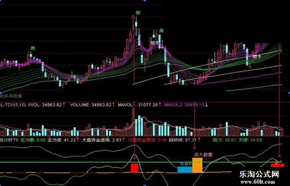 指标为分时图幅图指标,黄色柱为买入信号,红色柱为卖出信号,同一时段相同信号出现越密集说明指示越强,当在黄色柱同时出现向上红箭头时,向下绿色箭头和红色柱子同时出现时,说明有主力在抛,卖出后一般股价下跌可能达百分之85以上,若获利可了却半仓,改分时指标准确率极高,适合做波段股