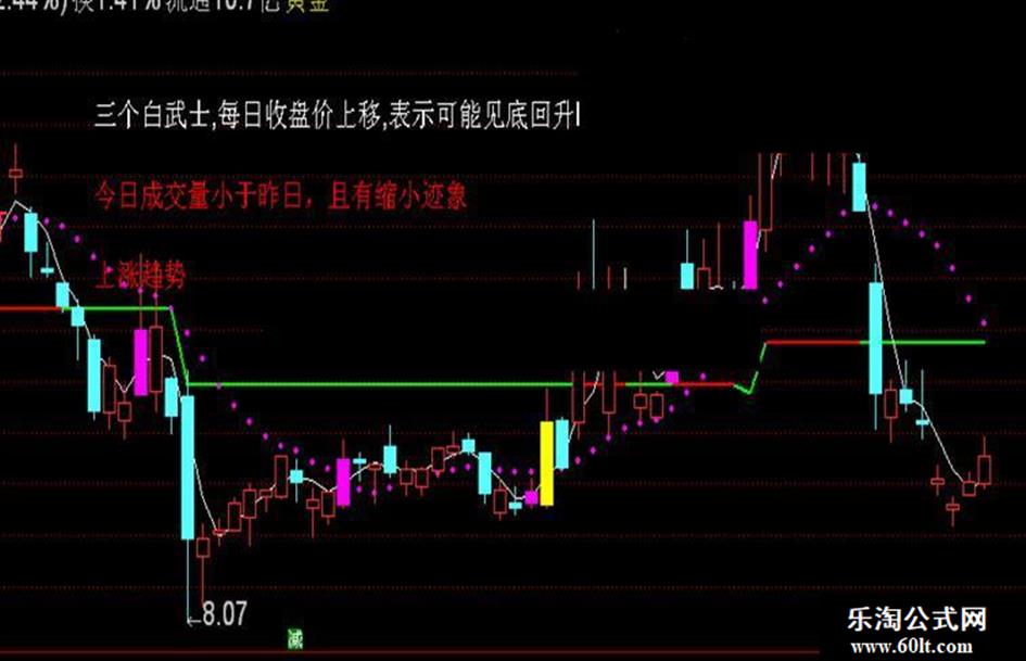 DRAWTEXT(T19=1 AND CURRBARSCOUNT=58,AAA-(AAA*TS19),'三个白武士,每日收盘价上移,表示可能见底回升‖'),COLORFFFFFF ;