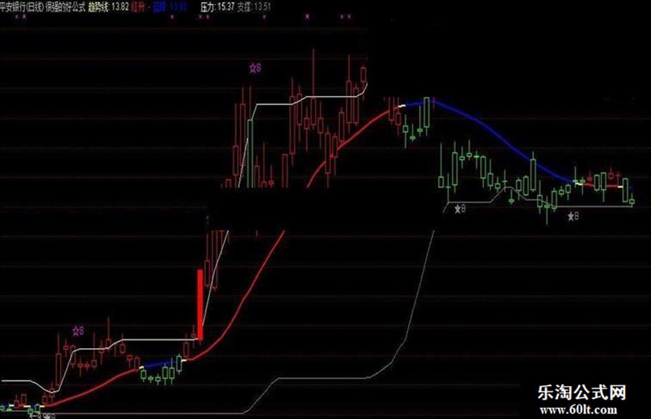 蓝降:IF(重心<趋势线,趋势线,DRAWNULL),COLORBLUE,LINETHICK2;