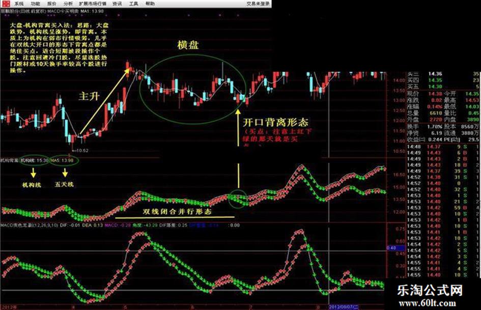 思路:大盘跌势,机构线呈涨势,即背离。本质上为机构在弱市行情吸筹,几乎在双线大开口的形态下背离点都是绝佳买点,适合短期波段操作个股。注意回避冷门股,尽量选股热门题材或10天换手率较高个股进行操作。