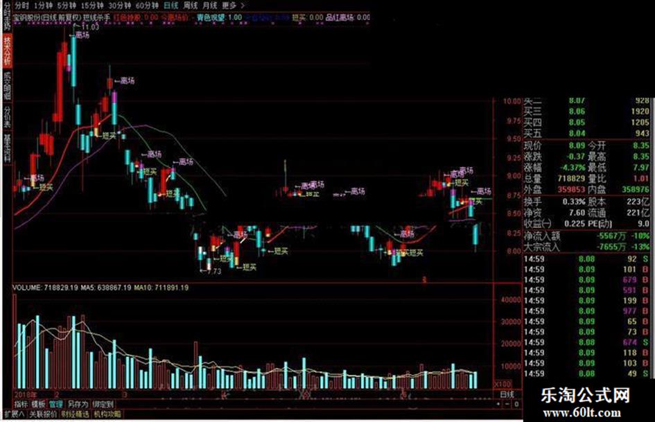 JRH:=HHV(C,2); JRL:=LLV(C,2); MA3:=MA(CLOSE,3); YTSL:=(3*CLOSE+LOW+OPEN+HIGH)/6; VAR1:=(CLOSE>REF(CLOSE,1) AND CLOSE>REF(CLOSE,2)); VAR2:=(REF(VAR1,1) AND CLOSE<=REF(CLOSE,1) AND CLOSE>=REF(CLOSE,2)); VAR3:=(REF(VAR2,1) AND CLOSE>=REF(CLOSE,1) AND CLOSE<=REF(CLOSE,2)); VAR4:=(REF(VAR3,1) AND CLOSE<=REF(CLOSE,1) AND CLOSE>=REF(CLOSE,2)); VAR5:=(REF(VAR4,1) AND CLOSE>=REF(CLOSE,1) AND CLOSE<=REF(CLOSE,2)); VAR6:=(REF(VAR5,1) AND CLOSE<=REF(CLOSE,1) AND CLOSE>=REF(CLOSE,2)); VAR7:=(REF(VAR6,1) AND CLOSE>=REF(CLOSE,1) AND CLOSE<=REF(CLOSE,2)); VAR8:=(REF(VAR7,1) AND CLOSE<=REF(CLOSE,1) AND CLOSE>=REF(CLOSE,2)); VAR9:=(REF(VAR8,1) AND CLOSE>=REF(CLOSE,1) AND CLOSE<=REF(CLOSE,2)); VARA:=(REF(VAR9,1) AND CLOSE<=REF(CLOSE,1) AND CLOSE>=REF(CLOSE,2)); VARB:=(REF(VARA,1) AND CLOSE>=REF(CLOSE,1) AND CLOSE<=REF(CLOSE,2)); VARC:=(REF(VARB,1) AND CLOSE<=REF(CLOSE,1) AND CLOSE>=REF(CLOSE,2)); VARD:=(CLOSE=REF(CLOSE,1) AND CLOSE<=REF(CLOSE,2)); VARF:=(REF(VARE,1) AND CLOSE<=REF(CLOSE,1) AND CLOSE>=REF(CLOSE,2)); VAR10:=(REF(VARF,1) AND CLOSE>=REF(CLOSE,1) AND CLOSE<=REF(CLOSE,2)); VAR11:=(REF(VAR10,1) AND CLOSE<=REF(CLOSE,1) AND CLOSE>=REF(CLOSE,2)); VAR12:=(REF(VAR11,1) AND CLOSE>=REF(CLOSE,1) AND CLOSE<=REF(CLOSE,2)); VAR13:=(REF(VAR12,1) AND CLOSE<=REF(CLOSE,1) AND CLOSE>=REF(CLOSE,2)); VAR14:=(REF(VAR13,1) AND CLOSE>=REF(CLOSE,1) AND CLOSE<=REF(CLOSE,2)); VAR15:=(REF(VAR14,1) AND CLOSE<=REF(CLOSE,1) AND CLOSE>=REF(CLOSE,2)); VAR16:=(REF(VAR15,1) AND CLOSE>=REF(CLOSE,1) AND CLOSE<=REF(CLOSE,2)); VAR17:=(REF(VAR16,1) AND CLOSE<=REF(CLOSE,1) AND CLOSE>=REF(CLOSE,2)); VAR18:=(REF(VAR17,1) AND CLOSE>=REF(CLOSE,1) AND CLOSE<=REF(CLOSE,2)); VAR19:=((REF(VARD OR VARE OR VARF OR VAR10 OR VAR11 OR VAR12 OR VAR13 OR VAR14 OR VAR15 OR VAR16 OR VAR17 OR VAR18,1)) AND VAR1); VAR1A:=((REF(VAR1 OR VAR2 OR VAR3 OR VAR4 OR VAR5 OR VAR6 OR VAR7 OR VAR8 OR VAR9 OR VARA OR VARB OR VARC,1)) AND VARD); 红色持股:VAR1 OR VAR2 OR VAR3 OR VAR4 OR VAR5 OR VAR6 OR VAR7 OR VAR8 OR VAR9 OR VARA OR VARB OR VARC,COLOR0000FF,NODRAW; 离场:=IF(红色持股,JRL,DRAWNULL); 明离场价:=离场,COLORFF99FF,NODRAW; 今离场价:REF(离场,1)COLOR0000FF,NODRAW; 青色观望:VARD OR VARE OR VARF OR VAR10 OR VAR11 OR VAR12 OR VAR13 OR VAR14 OR VAR15 OR VAR16 OR VAR17 OR VAR18,COLORFFFF00,NODRAW; 进:=IF(青色观望,JRH,DRAWNULL); 明进场价:=进,COLOR33AACC,NODRAW; 今进场价:REF(明进场价,1),COLORFF0000,NODRAW; 短买:VAR19,COLOR33AACC,NODRAW; 品红离场:VAR1A,COLORFF99FF,NODRAW; 急速超跌:(CLOSE-MA(CLOSE,34))/MA(CLOSE,34)*100<-14,COLORFFFFFF,NODRAW; 上市日期年:REF(YEAR,BARSCOUNT(CLOSE)-1),NODRAW,COLOR0000FF; 月:REF(MONTH,BARSCOUNT(CLOSE)-1),NODRAW,COLORFF00FF; 日:REF(DAY,BARSCOUNT(CLOSE)-1),NODRAW,COLOR00FFFF; 辰星线:(20*YTSL+19*REF(YTSL,1)+18*REF(YTSL,2)+17*REF(YTSL,3)+16*REF(YTSL,4)+15*REF(YTSL,5)+14*REF(YTSL,6)+13*REF(YTSL,7)+12*REF(YTSL,8)+11*REF(YTSL,9)+10*REF(YTSL,10)+9*REF(YTSL,11)+8*REF(YTSL,12)+7*REF(YTSL,13)+6*REF(YTSL,14)+5*REF(YTSL,15)+4*REF(YTSL,16)+3*REF(YTSL,17)+2*REF(YTSL,18)+REF(YTSL,20))/211,COLOR0000FF; 牵牛线:MA(CLOSE,26),COLORFF00FF; 等待:=IF(MA3>辰星线,辰星线,MA3); IF(等待>REF(等待,1),等待,DRAWNULL),LINETHICK2,COLOR00FFFF; IF(辰星线>REF(辰星线,1),辰星线,DRAWNULL),LINETHICK2,COLOR0000FF; IF(辰星线REF(牵牛线,1),牵牛线,DRAWNULL),LINETHICK1,COLORFF00FF; IF(牵牛线=O,L,H,0,0),COLOR0000CC; STICKLINE(C=O,C,O,3.5,0),COLOR0000E5; STICKLINE(红色持股,CLOSE,O,2.8,0),COLOR000055; STICKLINE(红色持股,CLOSE,O,2,0),COLOR000088; STICKLINE(红色持股,CLOSE,O,1.5,0),COLOR0000AA; STICKLINE(红色持股,CLOSE,O,1,0),COLOR0000CC; STICKLINE(红色持股,CLOSE,O,0.5,0),COLOR0000EE; STICKLINE(青色观望,CLOSE,O,2.8,0),COLOR555500; STICKLINE(青色观望,CLOSE,O,2,0),COLOR888800; STICKLINE(青色观望,CLOSE,O,1.5,0),COLORAAAA00; STICKLINE(青色观望,CLOSE,O,1,0),COLORCCCC00; STICKLINE(青色观望,CLOSE,O,0.5,0),COLOREEEE00; CO:=(C-O); STICKLINE(急速超跌,O,C-CO/2,2.8,0),COLOR555555; STICKLINE(急速超跌,O,C-CO/2,2,0),COLOR888888; STICKLINE(急速超跌,O,C-CO/2,1.5,0),COLORAAAAAA; STICKLINE(急速超跌,O,C-CO/2,1,0),COLORCCCCCC; STICKLINE(急速超跌,O,C-CO/2,0.5,0),COLOREEEEEE; STICKLINE(短买,O,O+CO/3,2.8,0),COLOR335555; STICKLINE(短买,O,O+CO/3,2,0),COLOR338888; STICKLINE(短买,O,O+CO/3,1.5,0),COLOR33AAAA; STICKLINE(短买,O,O+CO/3,1,0),COLOR33CCCC; STICKLINE(短买,O,O+CO/3,0,0),COLOR33EEEE; DRAWTEXT(短买,REF(CLOSE,1),'←短买'),COLOR33FFCC; STICKLINE(品红离场,O,O+CO/3,2.8,0),COLOR550055; STICKLINE(品红离场,O,O+CO/3,2,0),COLOR880088; STICKLINE(品红离场,O,O+CO/3,1.5,0),COLORAA00AA; STICKLINE(品红离场,O,O+CO/3,1,0),COLORCC00CC; STICKLINE(品红离场,O,O+CO/3,0.5,0),COLOREE00EE; DRAWTEXT(品红离场,REF(CLOSE,1)+0.1,'←离场'),COLORFF99FF;