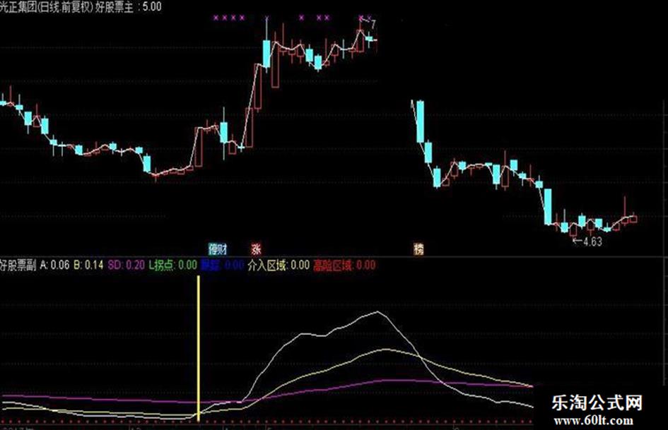 L拐点: IF(VAR1,VAR3 AND CROSS(A,B) AND B<0.6 AND B>VAR2,0),STICK,LINETHICK3,COLOR00FF00;