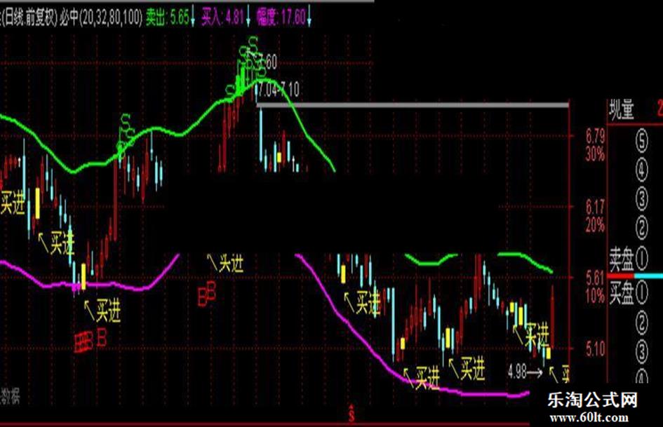 DRAWTEXT(CROSS(C,买入) OR (L<买入),LOW*0.95,'B'),COLORRED,LINETHICK2;