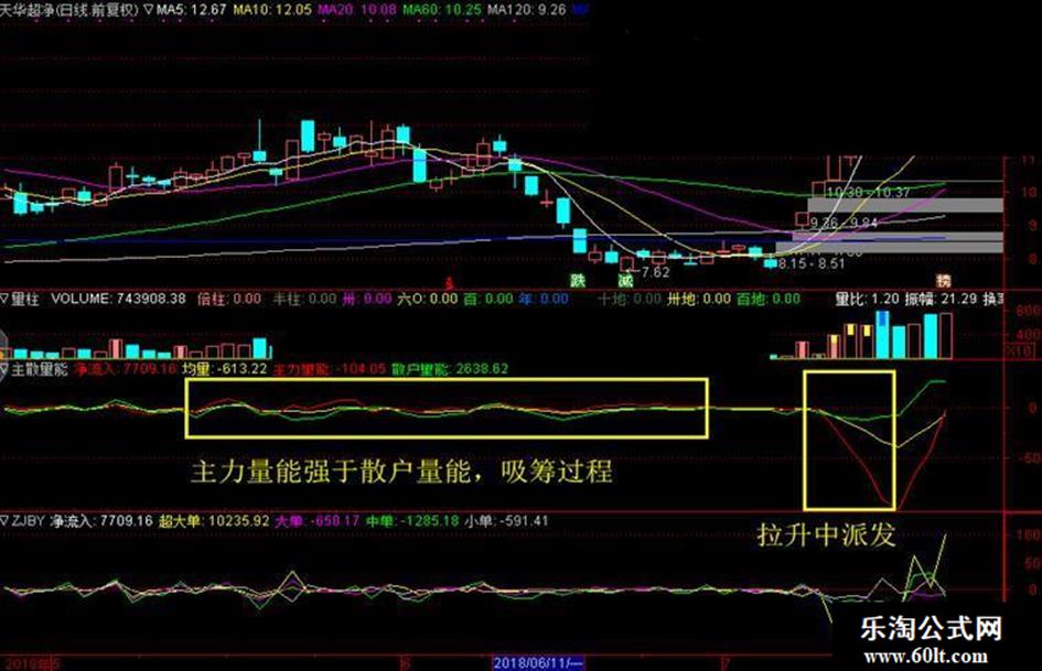 鉴于上面的原因,本人对这个指标进行了优化。优化后,只保留了三条线:均量、主力量能、散户量能。这样一看,就更能看清楚股票资金的变化及变化趋势。