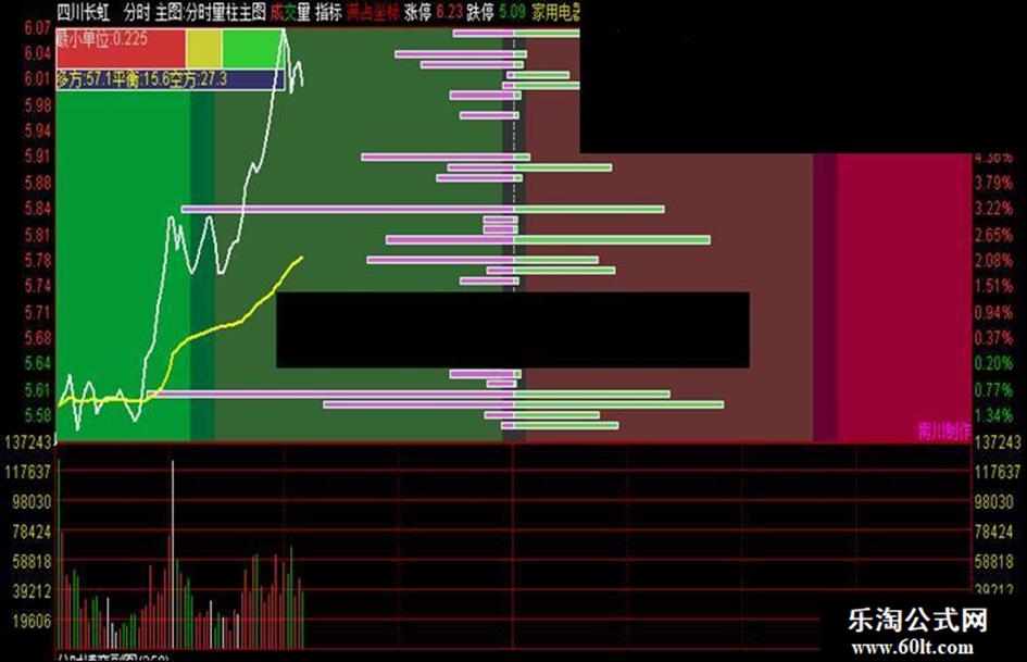 在本量柱图中有几点注意: 1.背景色,如果现价大于昨日收盘价,则绿转红;反之,红转绿,这在盘中飞速切换个股分时时把握宏观走势有奇效,望大家不要忽视; 2.左上角是多空力量,具有参考价值;右上角是一些基本必要信息,其中预估换手也有较大的参照意义; 3.左边是买柱,右边是卖柱,它们会随着时间的推移而变化,但请注意,这不是漂移,因为他们的位置长短高度都是由比例决定的,所以他们更像一种即时行情数据的静态反映,这点切记;