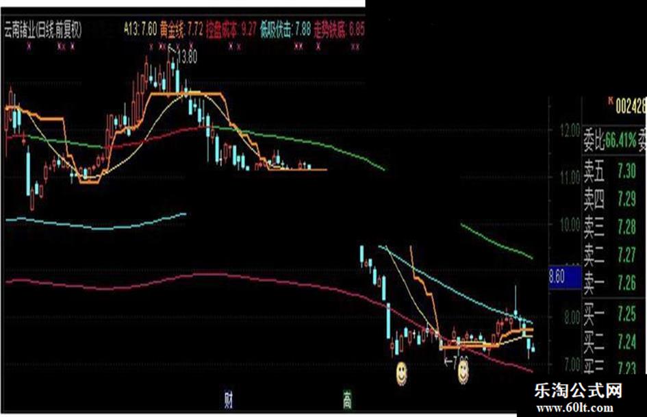 黄金线:(HHV(VAR1A,12)),LINETHICK2,COLOR0080FF;VAR1:=EMA(AMOUNT/VOL/100,3);