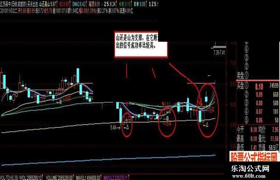 买:DRAWTEXT(CROSS(VAR1,MA(VAR3,VAR1)) AND B2>SMA2,(LOW * 0.97),'←⊙买'),COLORRED;