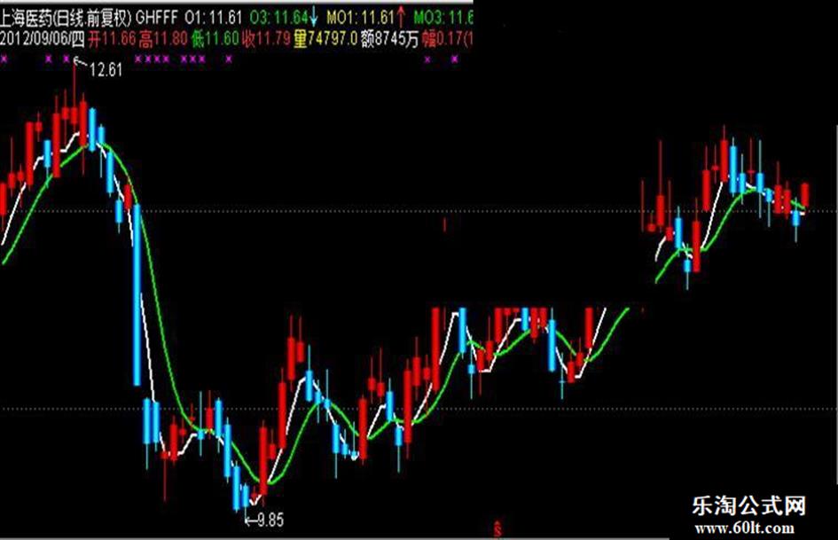 这个主图可以说都是网上得来的源码,只是根据自己的分析,在买卖点让K线变了色,提供给那些没有找到该源码的同学吧。用法一看便知,我这人懒,所以做的主图也好,副图也好,都是直接提示买卖的,主要还是人懒,懒得动脑分析,嘿嘿,其实这样不好。K线变红买入,变蓝卖出,就是卖点出的不太及时,在我的软件里这个主图我是加了一些别的买卖提示的,买卖点指标也都是网上得来的,为了给大家一个更广阔的改造空间,所以只取了核心部分出来。好了,睡觉去,快该开盘了,哈哈。