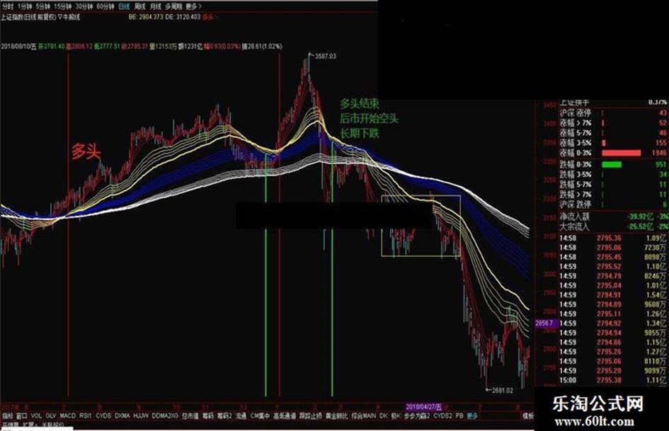 3、开始多头排列时,用红色竖线标记(后市看多),多头结束时用绿色竖线标示(后市不再看多,谨防赌气抄底!);