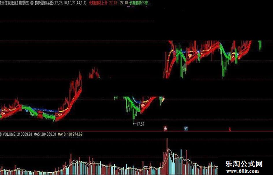 长期趋势下降:IF(TMP<=长期趋势线,长期趋势线,DRAWNULL),LINETHICK4,COLORGREEN;